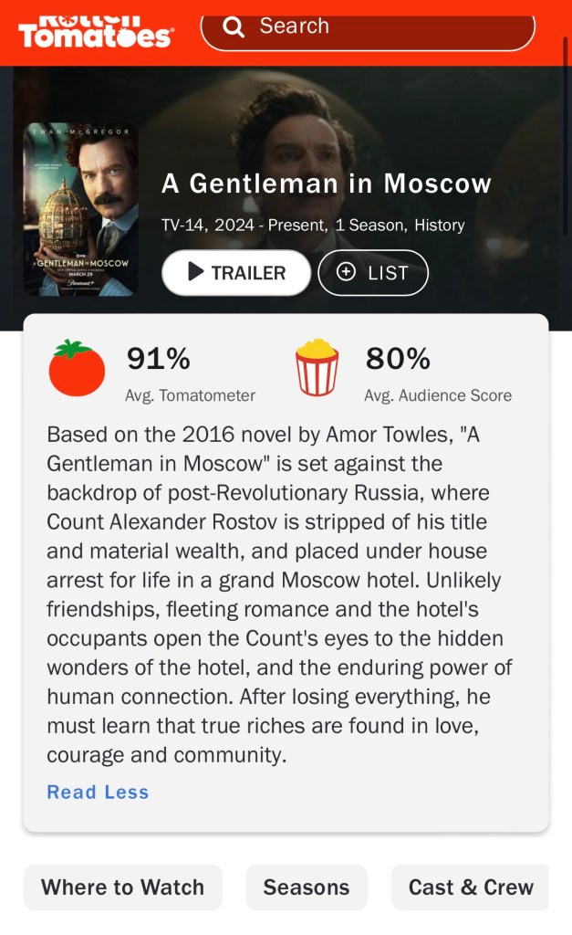 The series is based off of the 2016 novel of the same name by author Amor Towles. Listeners of our podcast will also know that Towles is one of my favorite current authors. I’ve mentioned a few of his books in our What’s Good segment of the show.
