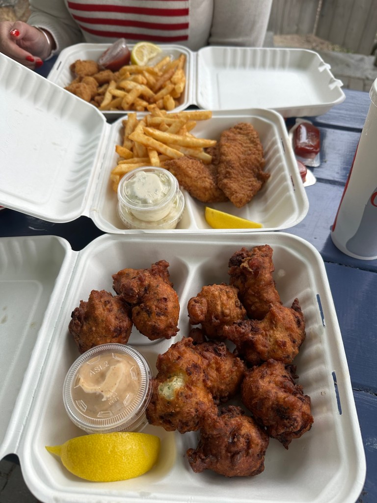On our next visit we decided to switch it up and try a few different things. We got an order of their famous clam fritters, which were beyond incredible. It was like a hush puppy, but with big chunks of clam in it and they were just so insanely good. I also got an order of their fish and chips and my wife got an order of their fried shrimp.