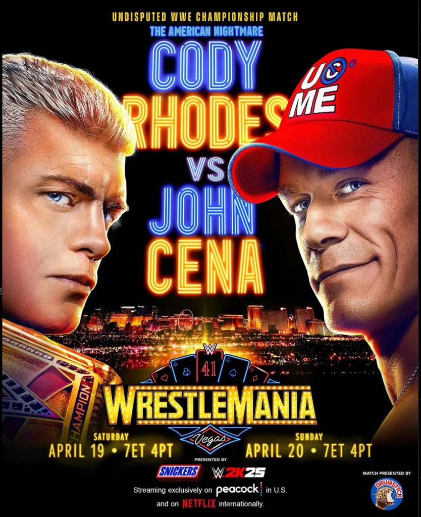 It’s the future vs. history in this match. One year ago, Cody Rhodes became the face of the company when he ended Roman Reigns’ 1,316 rule as champion. Since then, he’s been the IT guy for the WWE. If you asked me last year what I thought would happen at this year’s Mania, I would have told you Cody/Roman III. But alas, here we are. There’s been so many twists and turns to get here. John Cena announced his retirement tour and that 2025 would be his final year in the ring. He said he wanted to go out as a champion and break Ric Flair’s record of 16 championships by winning it one more time. So he entered the Royal Rumble and made it to the final two before being eliminated by Jey Uso. He followed that up with a win in the Elimination Chamber which gave him the opportunity to challenge Cody at Mania. Following Cena’s victory, Cody came out to congratulate him, but The Rock came out as well. There was had been tension building between The Great One and Cody Rhodes. The Rock wanted Cody to be his champion; a corporate champion so to speak. Cody hit Rock with a classic line: